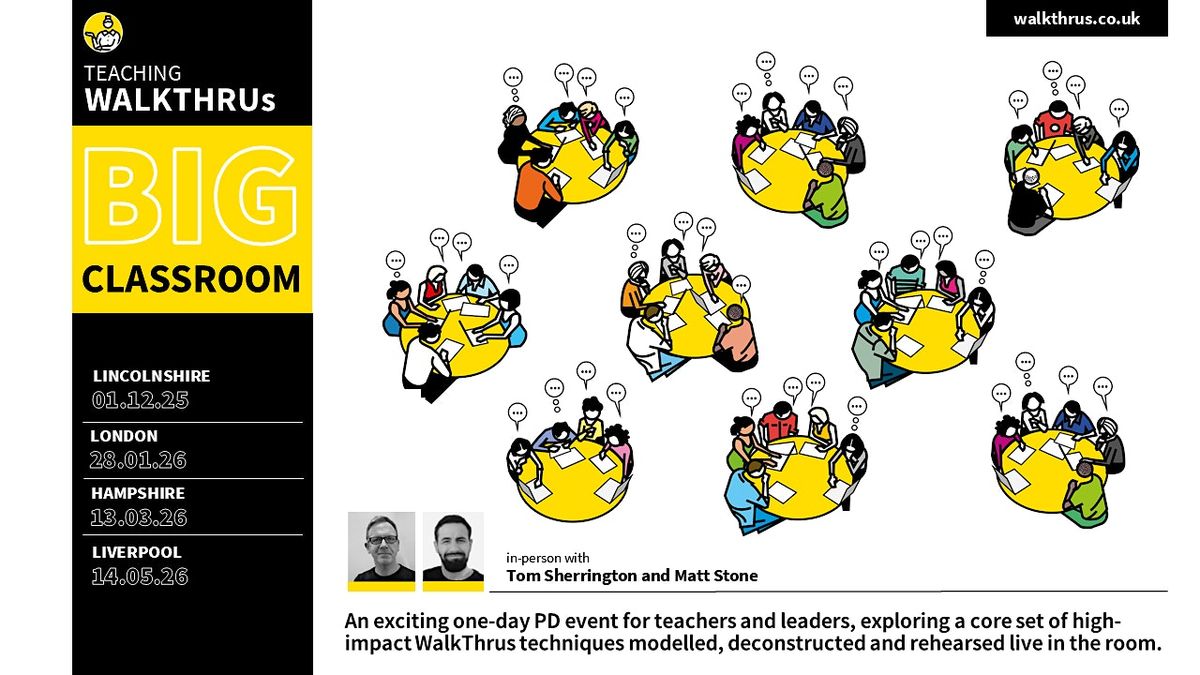The Big Classroom offers participants the opportunity to develop a range of practical teaching techniques; the highlights of all our training days with schools, packed into one day, led by Tom Sherrington and other members of the WalkThrus team.