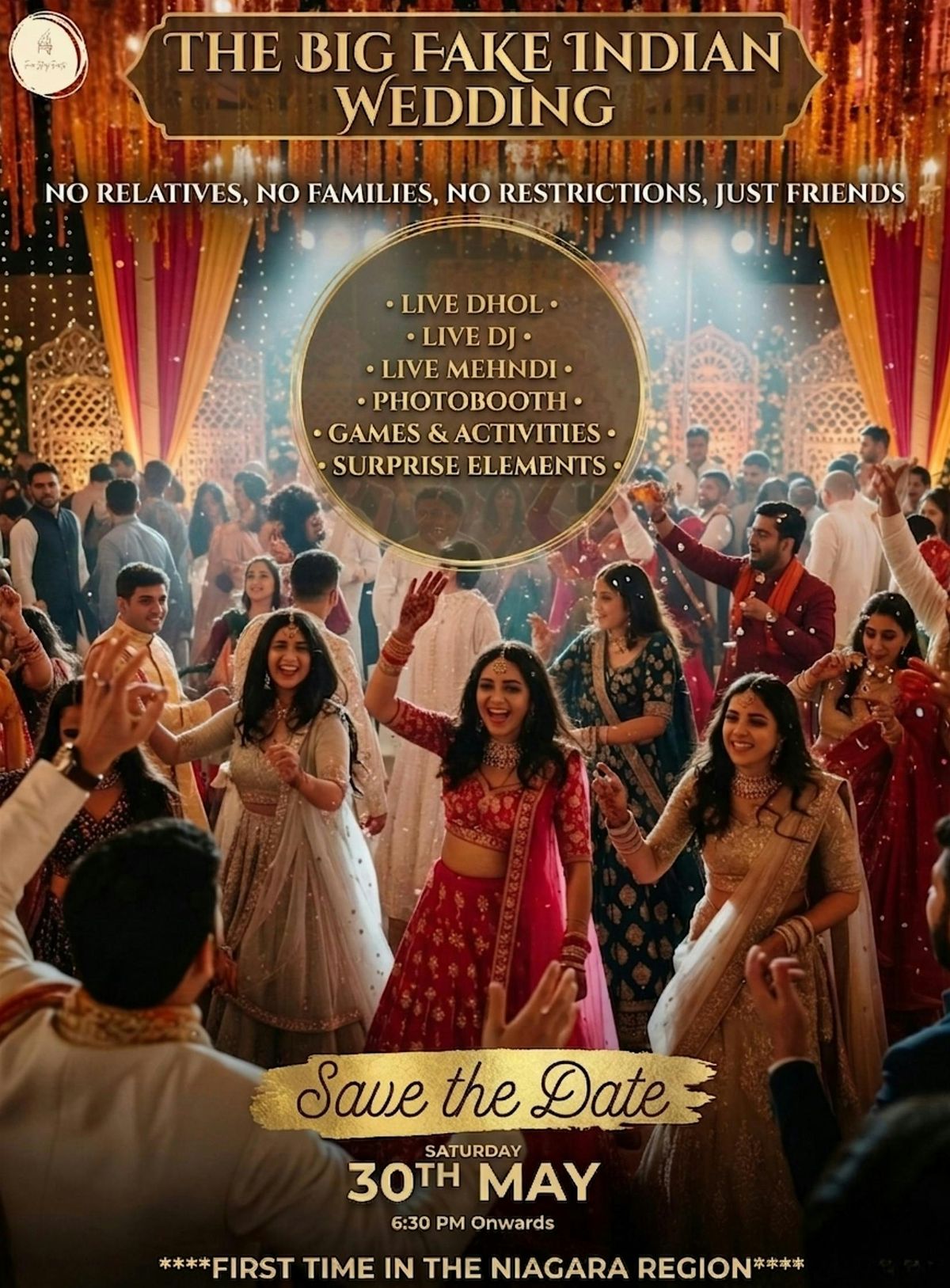 Are you ready to experience the vibrant, energetic, and joyous atmosphere of a traditional Indian wedding? Get ready for "This Big Fake Indian Wedding," a spectacular event coming to Niagara this May! Forget the stress of planning or the expectations of family – this event is all about pure, unadulterated fun, focused on bringing friends together for an unforgettable experience.Immerse yourself in an authentic shadi atmosphere featuring: