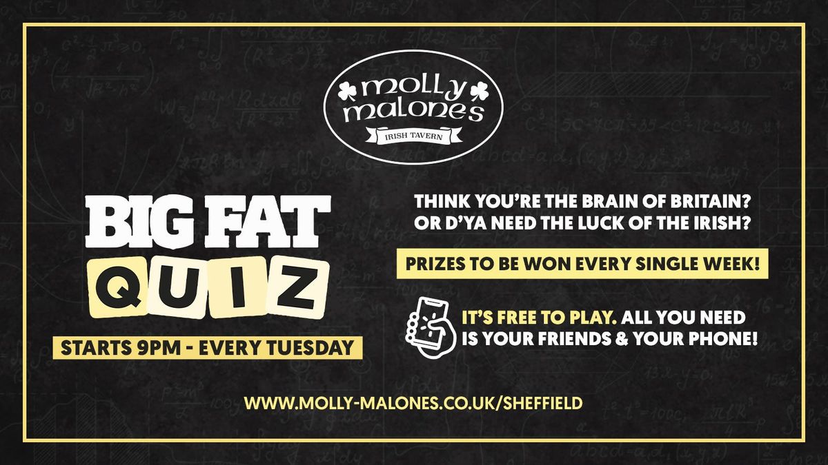 The Big Fat Quiz – Every Tuesday at Molly Malones, Sheffield📍 Molly Malones, West Street | 🕘 Every Tuesday, 9PM