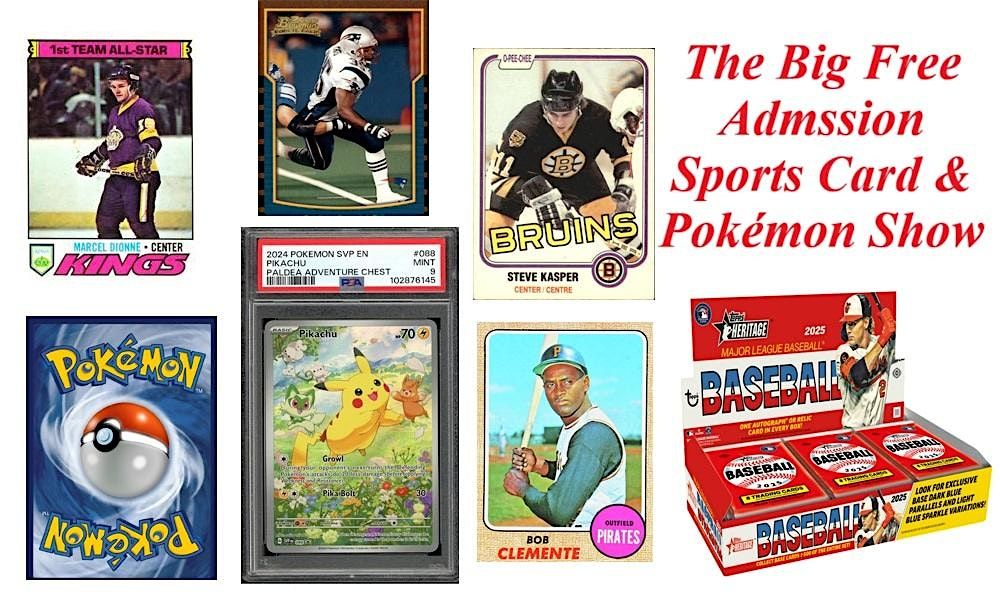 The Big Free Admission Spors Card & Pokemon Show, Sunday, March 8, 10 am-6 pm, Solomon Pond Mall, Marlboro. 157 Vendor Tables, Buy-Sell-Trade old and new sports cards, autographs, sports memorabilia, Pokemon and other TCG cards & collectibles. Former Bruin Steve Kaper signing free autographs. Regular Autograph Guests: Patriots 3 time Champ Patrick Pass & Hockey Hall of Famer Marcel Dionne
