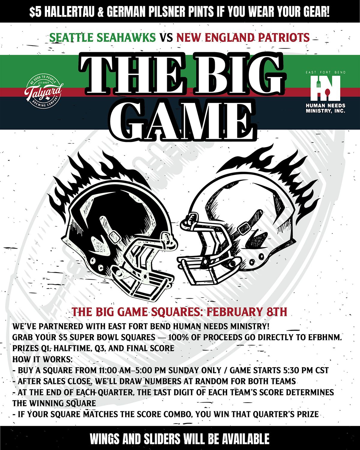 • If your square matches the score combo, you win that quarter’s prize — which may include Talyard merch, retail beer, gift cards, and more. Prizes awarded for Q1, Halftime, Q3, and Final Score.