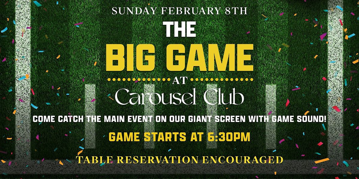 Sunday, February 8th, weāre having a magical Big Game watch party at Carousel Club. Catch the MAIN EVENT LIVE on our GIANT screen and witness all the excitement in an electrifying atmosphere- from GAME SOUND during the main event, to music during commercial breaks.