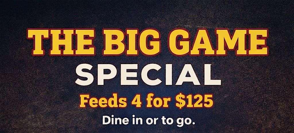 Where are you watching the big game on Sunday, February 8, 2026? Where you decide, make sure to pre-order our Big Game Special for 4 for $125. Dine in or order to go. It is all up to you. Meal includes: