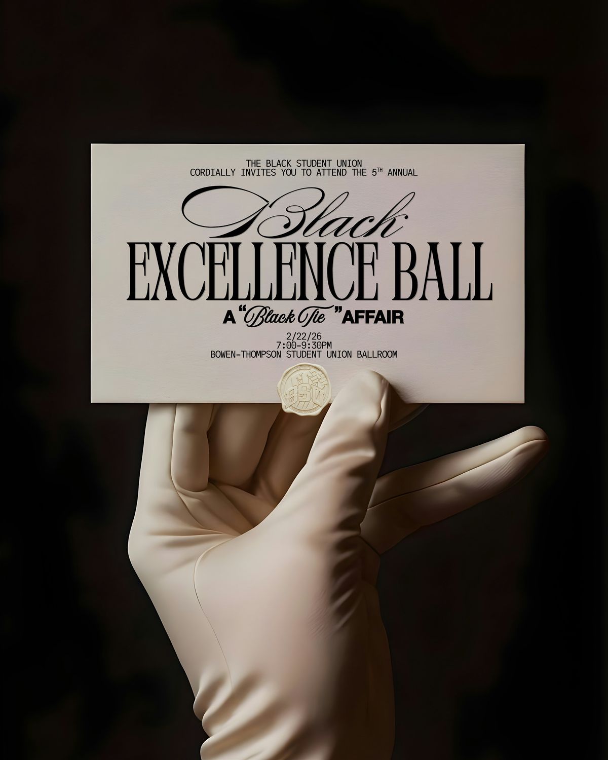 The Black Student Union cordially invites you to attend the Fifth Annual Black Excellence Ball: A Black Tie Affair.