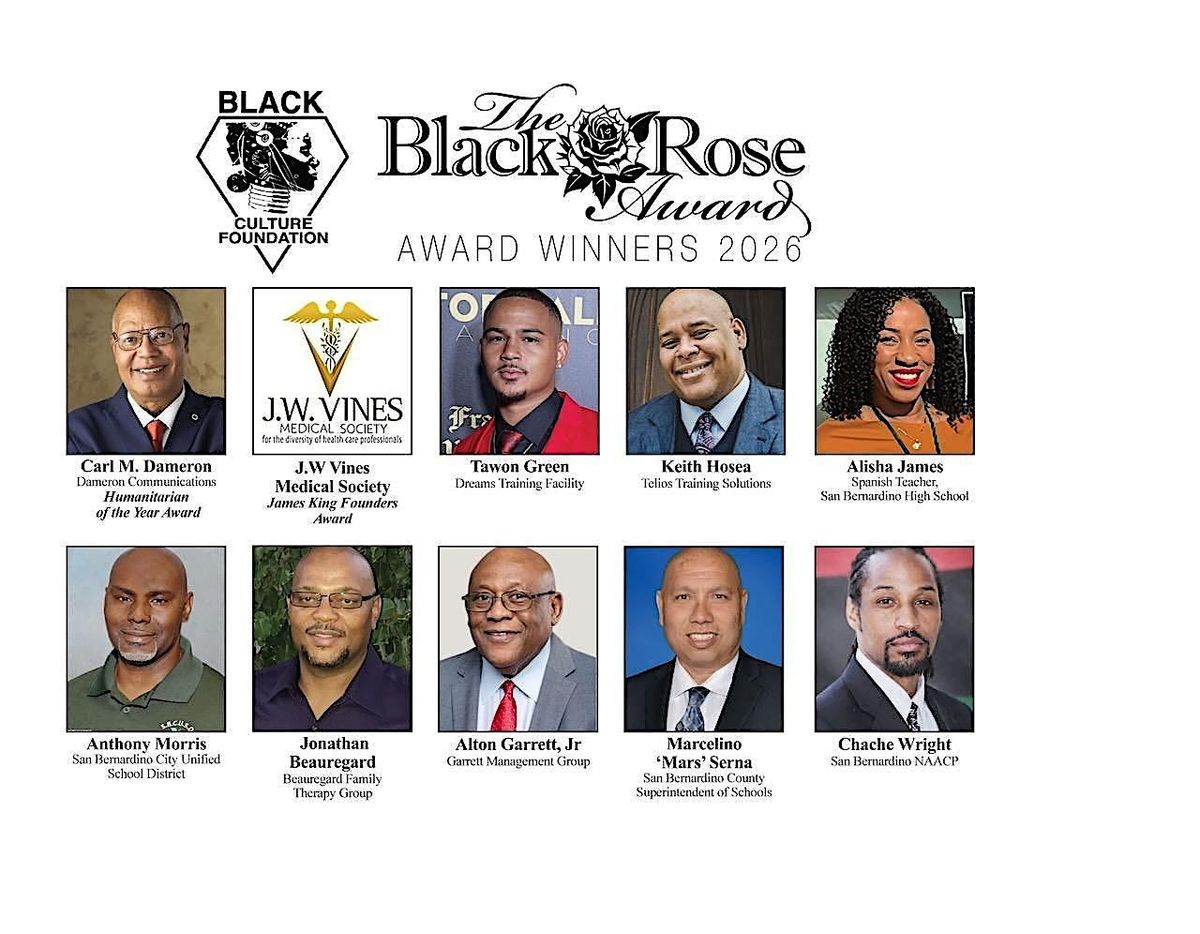 The 34th Annual Black Rose Awards ceremony will be held on Saturday, February 7, 2026, at 5:30 p.m., in the Santos Manuel Student Union at California State University, San Bernardino. Tickets are $125 per person. A table that seats eight is $840. Student tickets are $75, and a table that seats eight is $600.