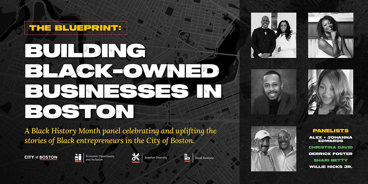 The City of Boston's Department of Supplier Diversity and the Office of Small Business is hosting a panel in honor of Black History Month. The event will take place on Thursday, February 26th from 10am-1pm and will celebrate and uplift the stories of black-owned businesses in the City of Boston. Business owners will speak on their story, struggles, and experiences working in or contracting with the City. Attendees will have the opportunity for networking. Light refreshments will be served at the conclusion of the panel.