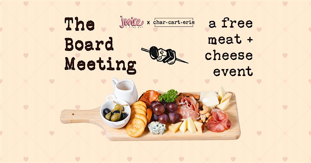 Juice Wine Bar is delighted to invite YOU to join us for an important BOARD meeting, if you will. We'll be showcasing our new sister business, Char-Cart-Erie, a rentable charcuterie event catering cart. Guests will be allowed to make selections from our community meat & cheese board from 6-9PM! Don't miss out -- who doesn't like free food?