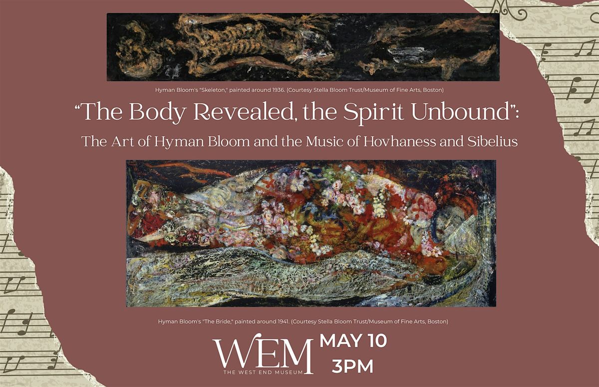 Join the West End Museum and the Peridot String Quartet for a clasical program that brings into dialogue the unflinching anatomical paintings of West End native Hyman Bloom with the searching, elemental music of his contemporary colleagues Alan Hovhaness and Jean Sibelius. Bloom’s cadaver studies—at once visceral and reverent—confront the physical reality of the human body while suggesting a mysterious passage beyond it. In parallel, the music traverses stark ritual, austere landscapes, and moments of luminous stillness, evoking forces that feel at once ancient and transcendent.