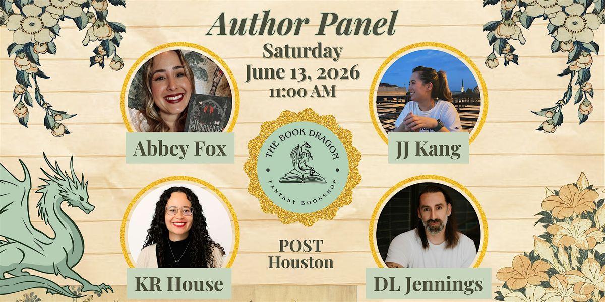 Info: Author panel featuring DL Jennings, KR House, JJ Kang, and Abbey Fox, with moderator Michael Carrell - cohost of Comicast and on-air contributor to ESPN Houston.