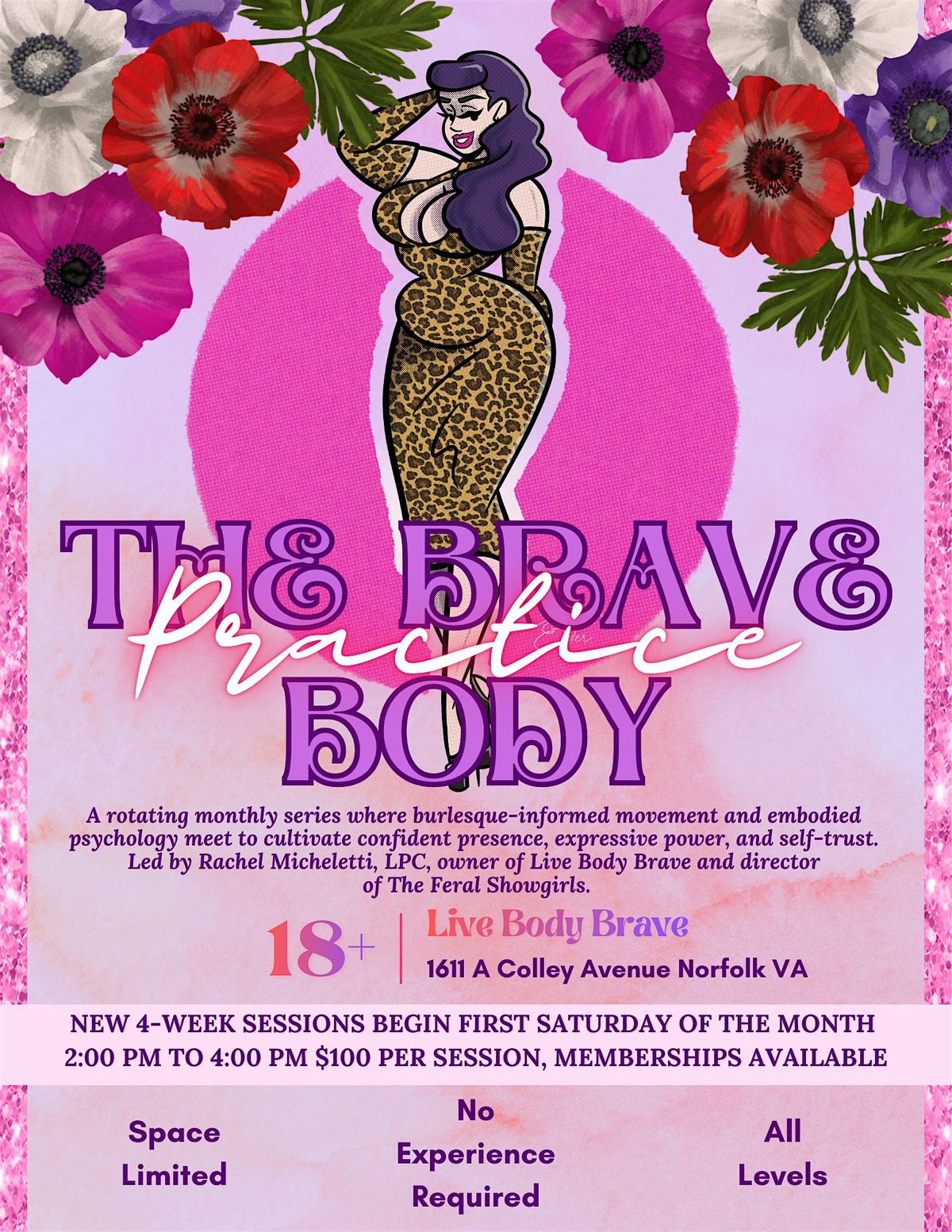 The Brave Body Practice is a monthly weekend series using burlesque-informed movement, embodiment practices, and psychological tools to build confidence, presence, and expressive freedom—on stage and in everyday life.