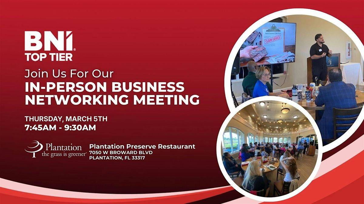 Join us for an awesome in-person gathering where business pros connect over a delicious breakfast! It's your chance to network, share ideas, and grow with the best in the game. Don’t miss out on this perfect mix of great food and even better company. Let’s make mornings productive and fun with BNI Top Tier Plantation!