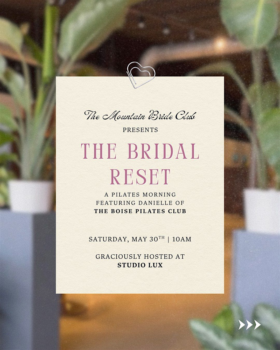 The Bridal Reset is a ticketed wellness morning designed exclusively for brides-to-be. Join us at Studio Lux on May 30th for a 45-minute mat Pilates class led by Danielle of Boise Pilates Club, followed by a morning full of intentional extras — a coffee cart, flower bar, live embroidery, permanent jewelry, esthetician services, and a curated goodie bag to take home.