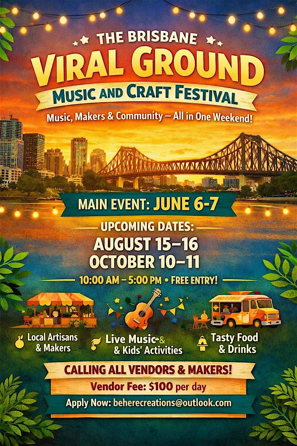 Are you an artisan, musician, food vendor, or small business owner looking to showcase your work and connect with the community? The Brisbane Viral Ground Music and Craft Festival is the perfect opportunity to grow your brand and be part of a supportive, creative environment.