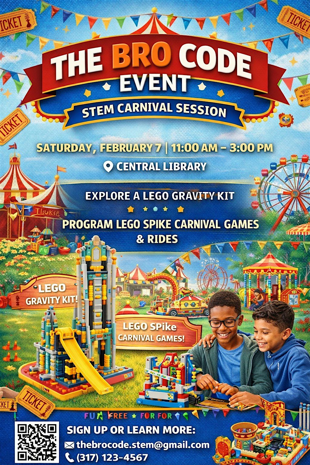 Join us for a fun, hands-on STEM Carnival experience with The Bro Code! Boys in grades K–12 will explore a LEGO Gravity Kit and program LEGO SPIKE carnival games and rides, combining creativity, engineering, and problem-solving.