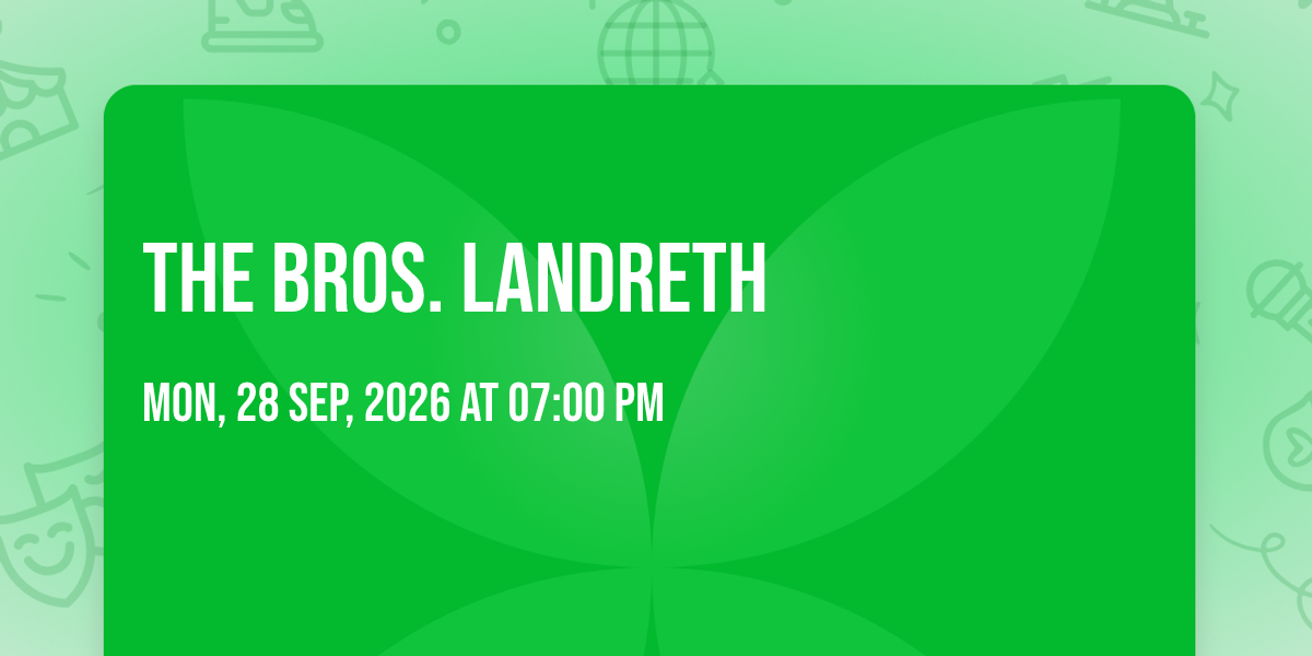 ✨ Enter a world of endless possibilities at The Bros. Landreth, where every moment tells a story! 🏛️ The stunning Vinyl - GA in vibrant Atlanta, GA transforms into a realm of wonder on September 28th, 2026 at 07:00 PM. 🌟 They have crafted an experience that goes beyond the ordinary, combining elements of surprise, delight, and pure entertainment. Every detail has been thoughtfully considered to ensure your journey with us is nothing short of extraordinary. 🎯 Join fellow adventure seekers and memory makers in this celebration of imagination and innovation. 🎊 Reserve your spot today and be part of something truly special!http://maps.seatics.com/GeneralAdmissionEvent_2019-09-30_1208_SVGC_tn.gif