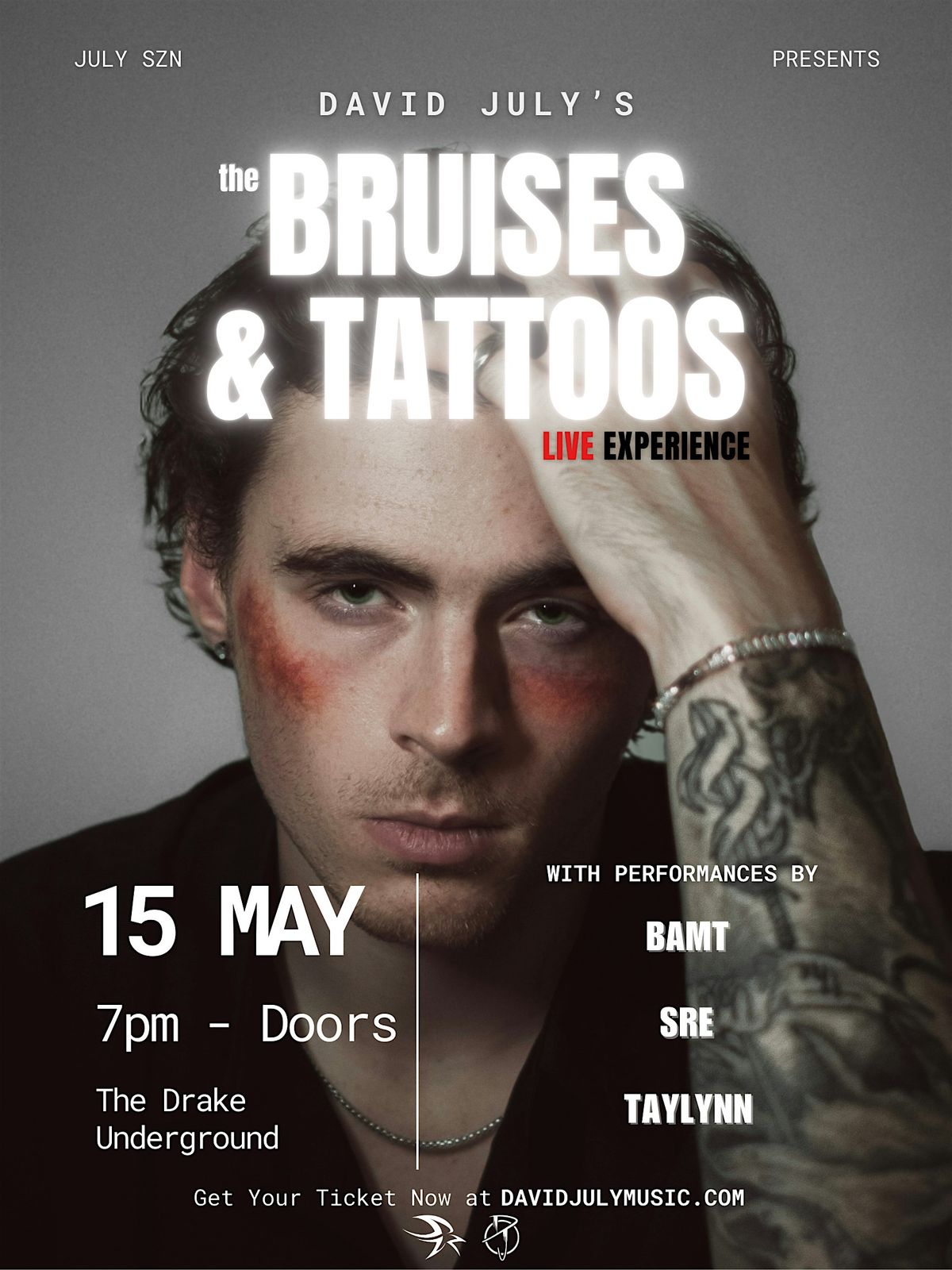 Don't miss out on this one-and-done event at the iconic Drake Underground, witnessing the live experience of David July's new album "Bruises & Tattoos", with music coming from the minds of passionate professionals David July, Bamt, Taylynn, and SRE. Join us to dive into a night packed with epic performances, cool people, and a whole lot of fun. Get the first look at JULY SZN, a lifestyle brand and community with all new (limited) products/apparel showcased during this exciting night. Whether you're here for the music or just to soak up the atmosphere, THE BRUISES & TATTOOS LIVE EXPERIENCE is where you wanna be!