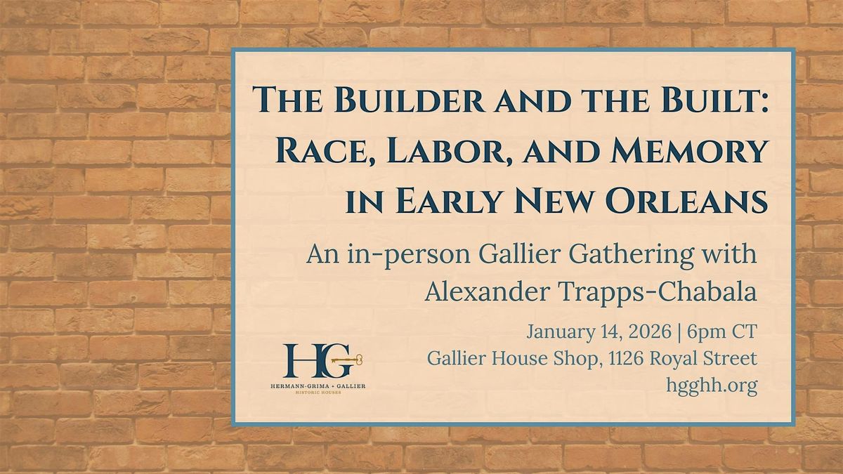 This talk uncovers the life of Dawson Wright, an enslaved bricklayer trafficked from Virginia to New Orleans and sold in 1836 at Hewlett’s Exchange—just blocks from the Hermann-Grima House he may have helped construct. Using genealogical research and close reading of sale documents, building contracts, and family archives, this lecture examines how New Orleans preserved the legacy of enslavers like builder William Brand while obscuring the skilled laborers who actually shaped the city’s early architecture.