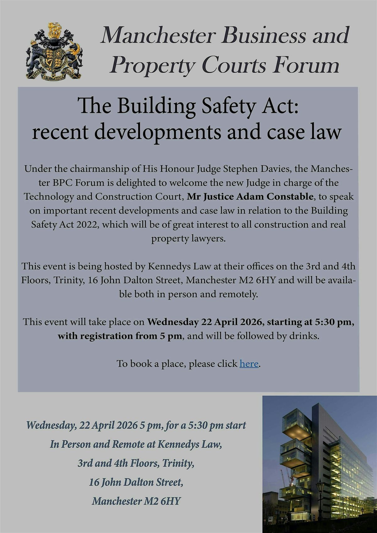 This event is being hosted by Kennedys Law at their offices on the 3rd and 4th Floors, Trinity, 16 John Dalton Street, Manchester M2 6HY and will be available both in person and remotely.