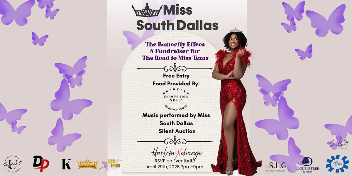 Join us for an evening of music and fun as we come together to celebrate Miss South Dallas's journey to the Miss Texas crown and honor our community's support. The Butterfly Effect is a fundraiser mixer held at Harlem Xchange on April 29th from 7 to 9 PM. Enjoy delicious food from Brooklyn Dumpling Shop, a live performance by Miss South Dallas, and a silent auction. Entry is free, and your RSVP reserves your spot. If you'd like to contribute further, each donation benefits the Miss Texas Scholarship Foundation, a 501(c)(3). We look forward to seeing you there!