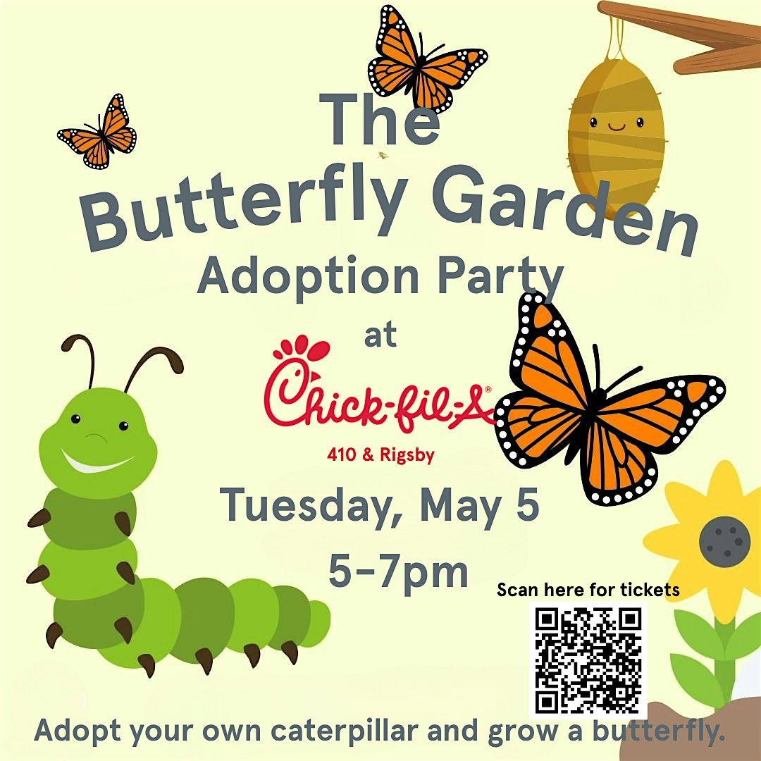 Join us for a fun-filled event at Chick-fil-A 410 & Rigsby- The Butterfly Garden Adoption Party! Kids will have the chance to adopt their very own caterpillar, and watch it grow into a beautiful butterfly. Not only will they learn about the lifecycle of a butterfly, but they'll also get to create a fun craft to take home. The ticket includes:1 caterpiller adoption, 1 craft, 1 butterfly house, storytime, and a Strawberry Hibiscus Drink. This is a limited ticket event, so be sure to secure your spot early! Don't miss out on this unique and exciting experience for your child. We can't wait to see you there!