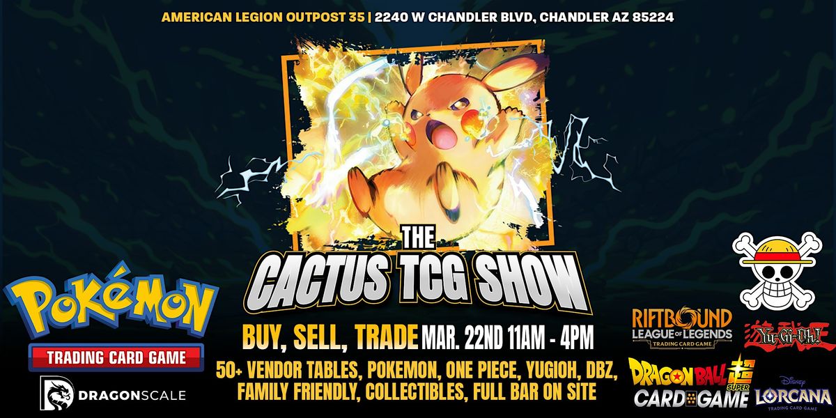 50 Vendor Tables, all things Pokemon TCG, One Piece, DBZ, Collectibles, and more! Located just off the 101 near Chandler Fashion Center, bring the family, your binder, and come hang out for a TCG packed sunday afternoon.