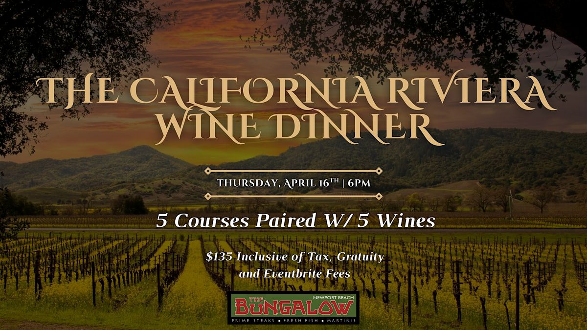 You're cordially invited to join us at our California Riviera Wine Dinner on Thursday, April 16th at 6pm!