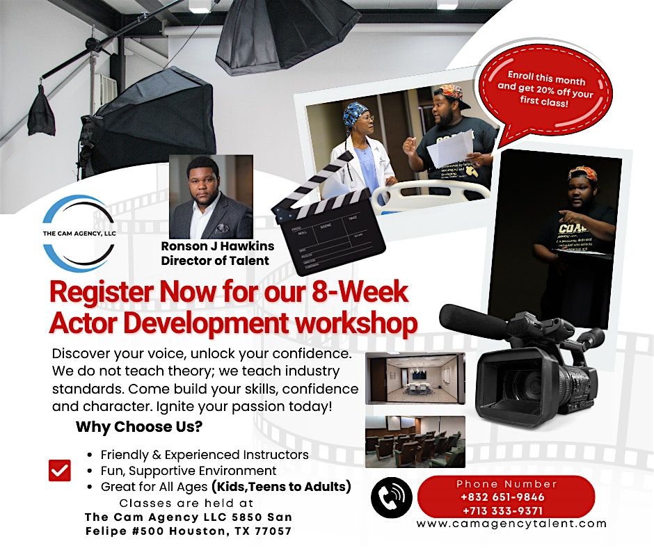 The Cam Agency, LLC Talent Division proudly invites all aspiring actors — kids, teens, and adults — to attend our exclusive Open House & Registration Event for our 8-Week Professional Acting Course Saturday, March 21, 2026. The Open House will be held at The Cam Agency, located at 5850 San Felipe #500 Houston, TX 77057.