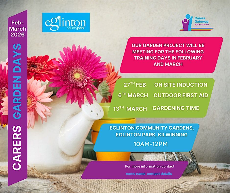 Join us on Friday 27th February, Friday 6th March, and Friday 13th March from 10am–12pm at Eglinton Community Gardens, Eglinton Park, Kilwinning.