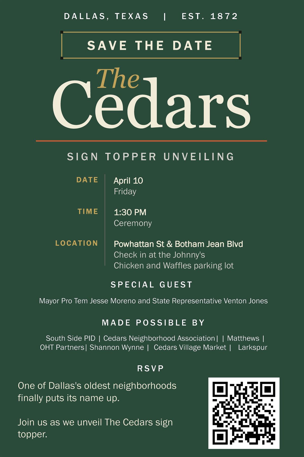 One of Dallas's oldest neighborhoods finally puts its name up. Join us as we unveil The Cedars sign topper.About this Event