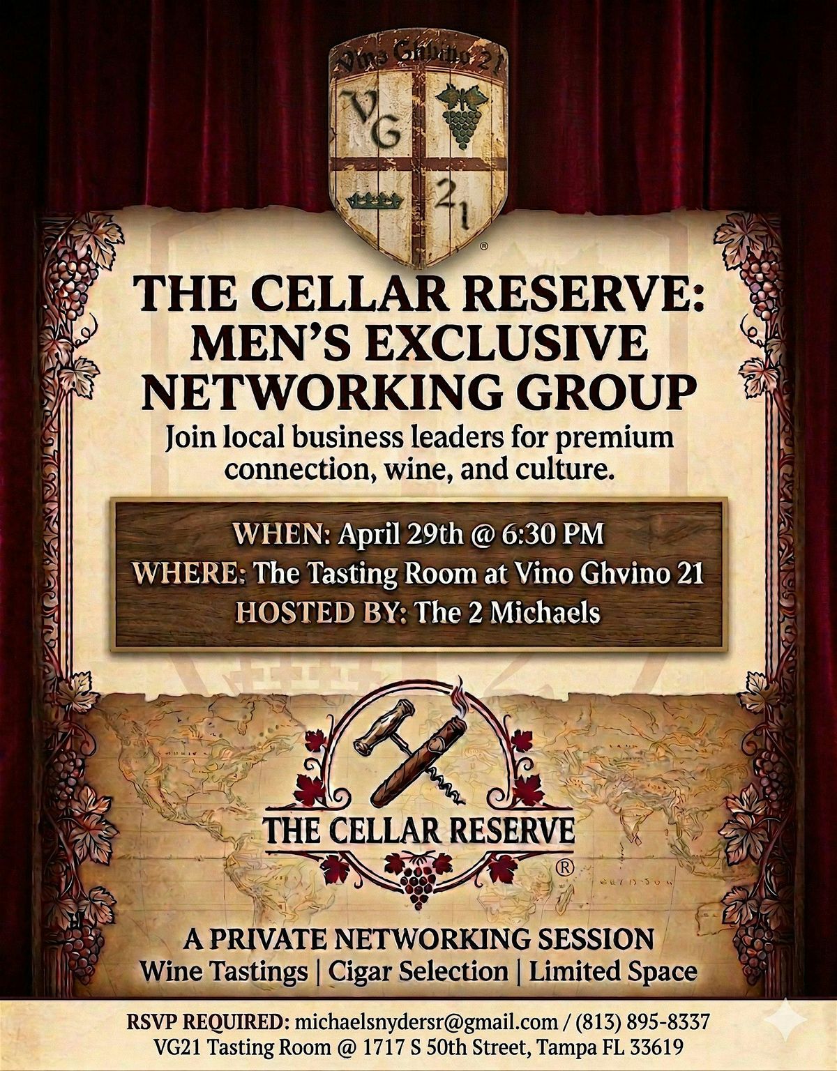Join the 2 Michaels at Vino Ghvino 21 on April 29, 2026 at 6:30 PM (Eastern Time) the last Wednesday of the month for a relaxed evening of connecting with like-minded professionals. This is a Private Networking Session with Wine Tasting/ Cigar Selection and maybe other surprises. This is your chance to unwind, share stories, and expand your network in a casual, welcoming spot. Whether you're here to make new friends or business contacts, expect good vibes and great conversations. Don’t miss out on this exclusive gathering designed just for men. See you there!