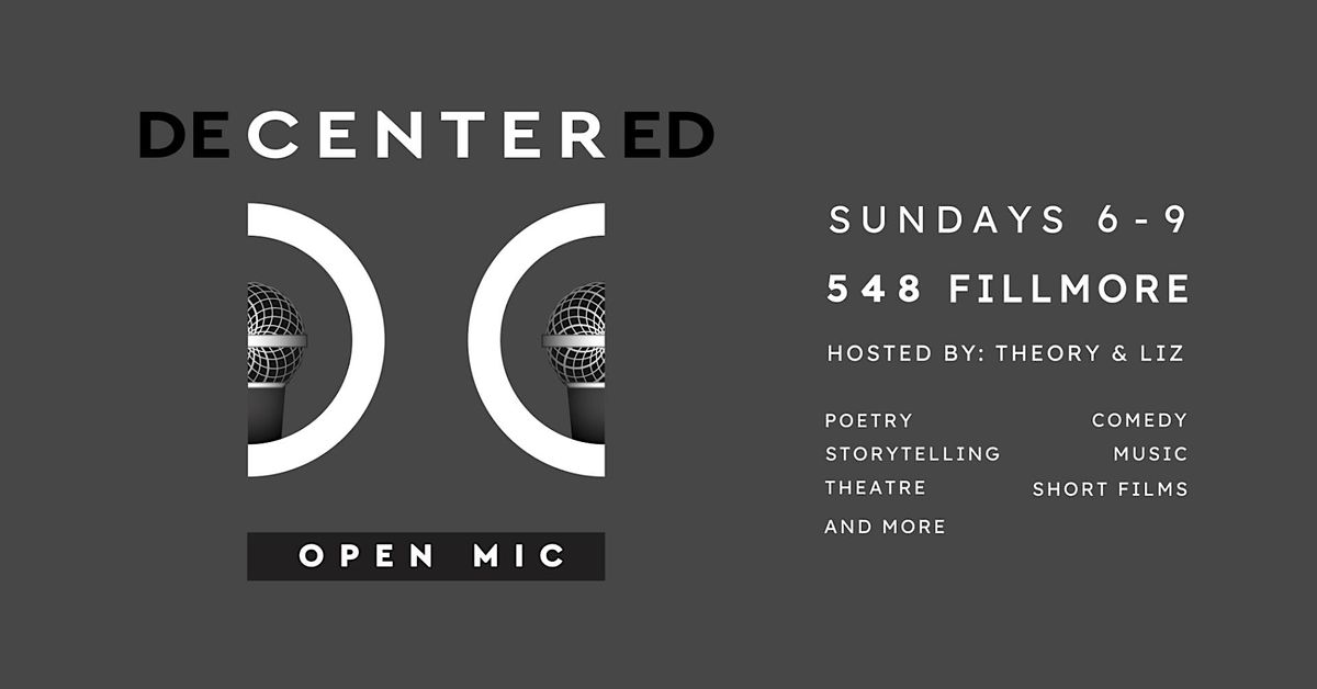 Welcome to Decentered, a space where you can shine your light, exorcise your demons and give others a glimpse into your corner of the universe. Music, poetry, storytelling or any art forms yet to be born on our stage, all are welcome. Join us every Sunday at 6pm.