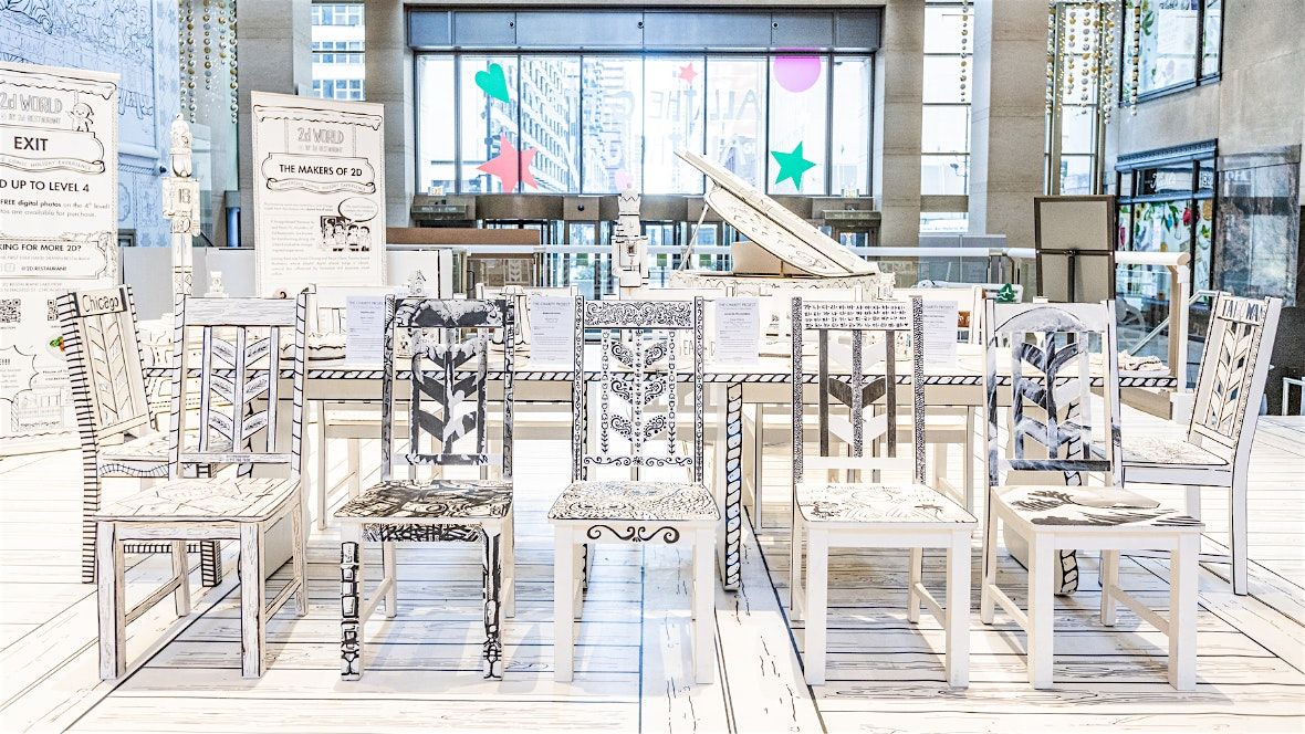 As part of 2d World’s immersive Chairity Project, ten Chicago-based artists and content creators have transformed signature 2d chairs into original works of art inspired by the theme “A Moment of Joy.” During this special event, guests will have the opportunity to: