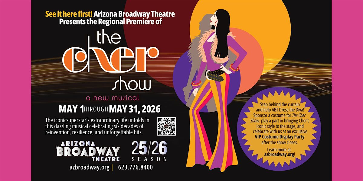 Get ready to turn back time and celebrate in style! Arizona Broadway Theatre invites you to an unforgettable night of glamour, music, and all things Cher at our Cher Costume Party on June 3.Step beyond the stage and experience the magic up close with a dazzling display of costumes from The Cher Show—each piece capturing an iconic moment from Cher’s legendary career. From bold, era-defining looks to sparkling concert ensembles, this is your chance to see the artistry behind the spectacle.