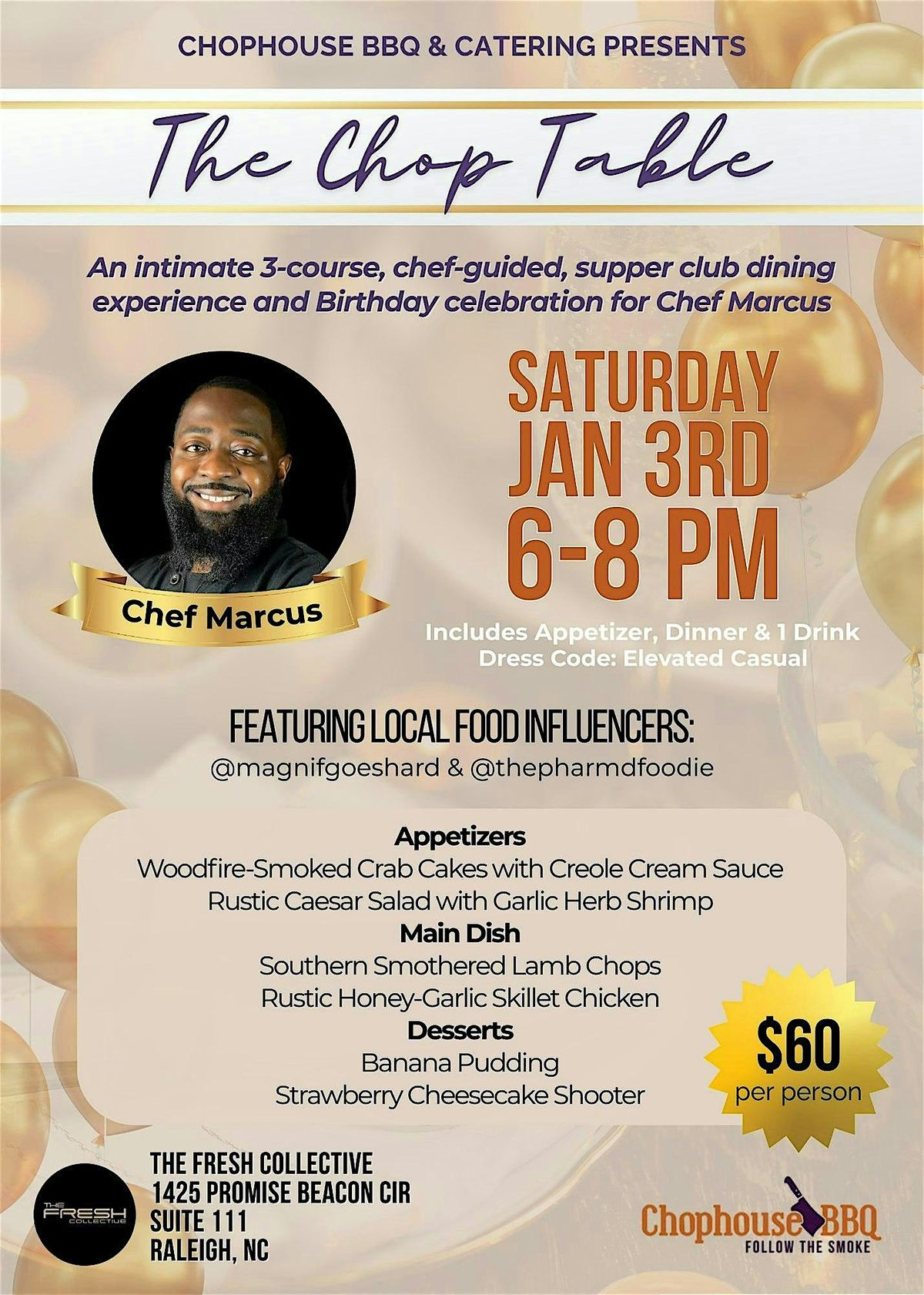 Welcome to The Chop Table event at Fresh Collective NC! Join us on January 3, 2026 at 6:00 PM (Eastern Time) for a night of delicious food and great company. Get ready to enjoy a variety of dishes prepared by talented chefs. Don't miss out on this amazing culinary experience!