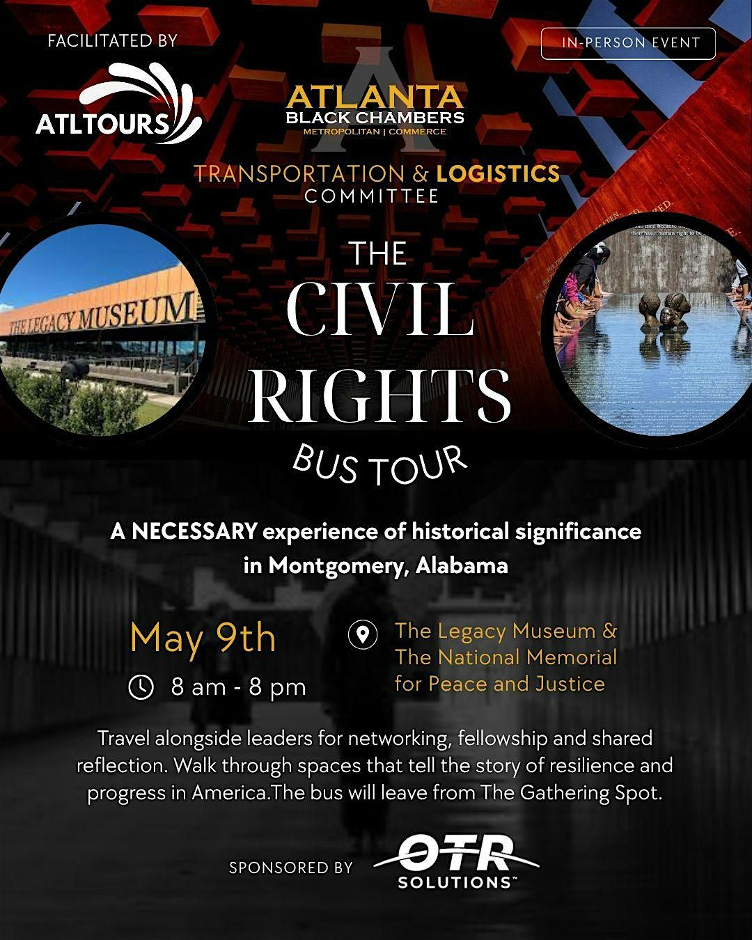 This curated experience brings together history, community, and connection in a meaningful way. These are not just museums—they are essential American experiences!Atlanta Black Chambers Presents: The CIVIL RIGHTS Bus TourJoin the Atlanta Black Chambers’ Transportation & Logistics Committee (ABC-TLC) in partnership with its member, ATL Tours, for a powerful, one-day journey from Atlanta to Montgomery. The tour is comprised of two of the nation’s most impactful historical institutions.All attendees will meet on the morning of Saturday May 9th at a central location in Atlanta where you can safely leave your vehicle. More details will be provided soon regarding this location. The itinerary is as follows:Leave for Montgomery 8am