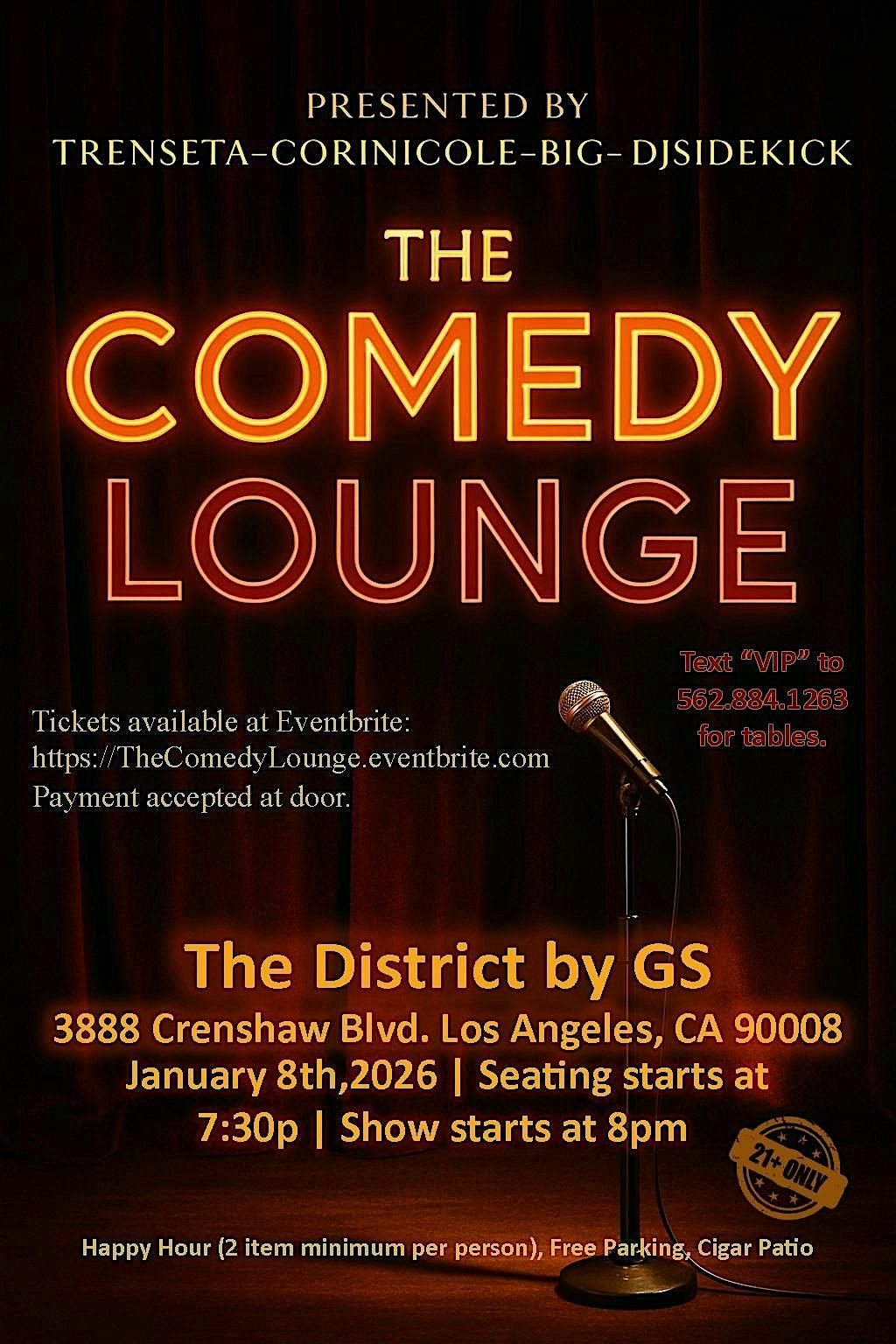 kickstart the year at The Comedy Lounge on January 8th, 2026 at The District by GS (3888 Crenshaw Blvd., Los Angeles, CA 90008)