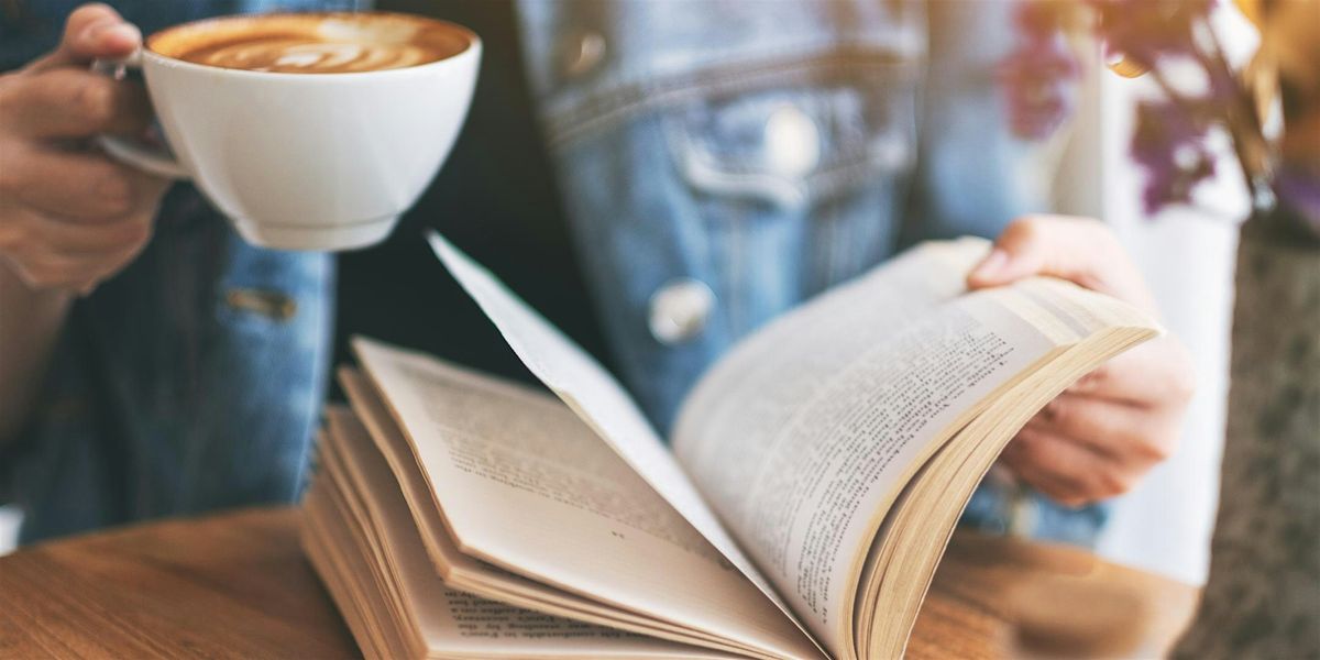 Image: Person in a denim jacket with a coffee in one hand and an open book resting on a table in the other.