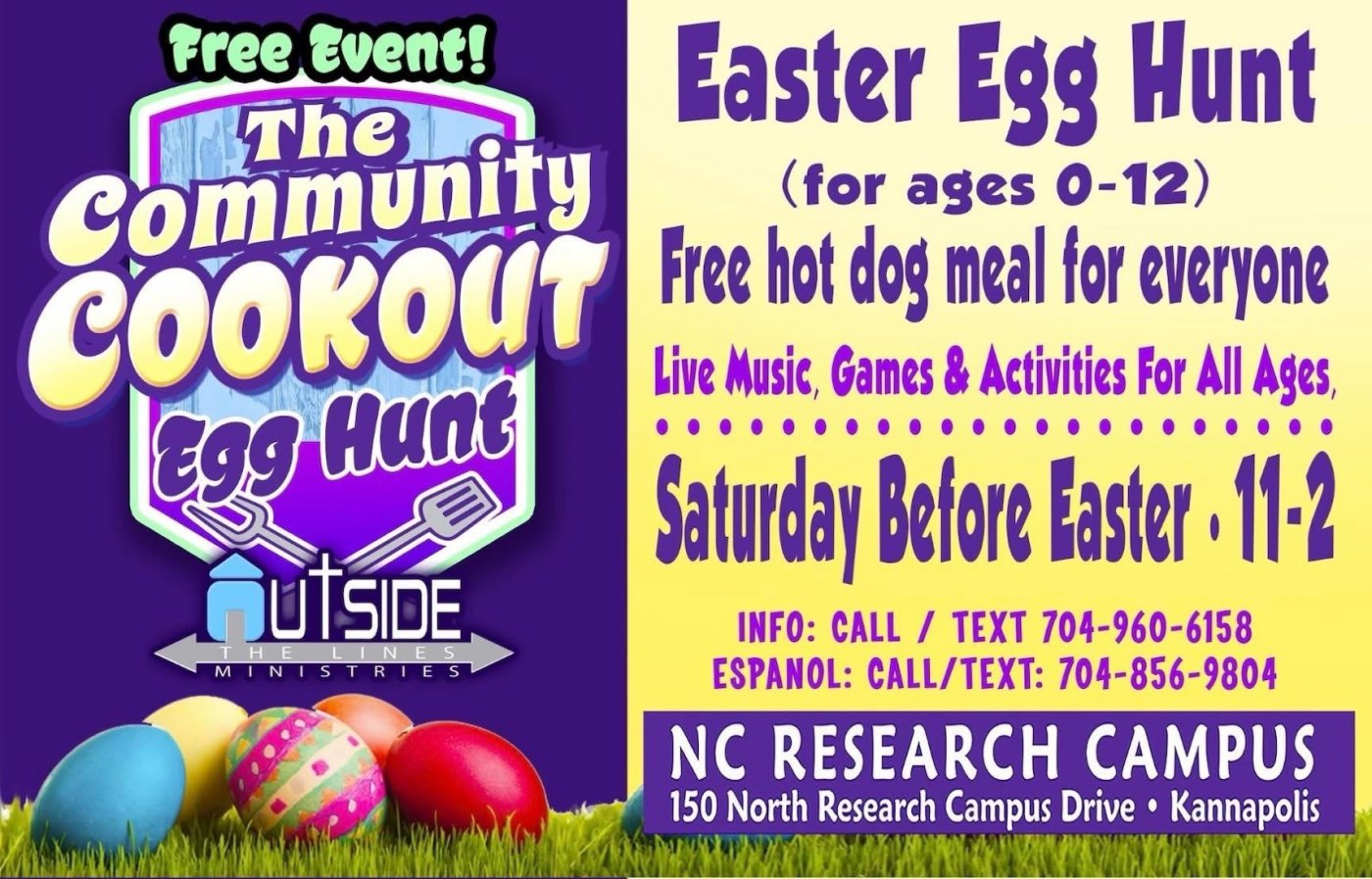 The Community Cookout & Egg Hunt is a fun, free, family-friendly event in Kannapolis, NC with live music, games & activities, including a 26' rock climbing wall, free food, and a HUGE EGG HUNT for kids ages 0-12 years old. Held annually since 2011, the day before Easter at a local school or park.