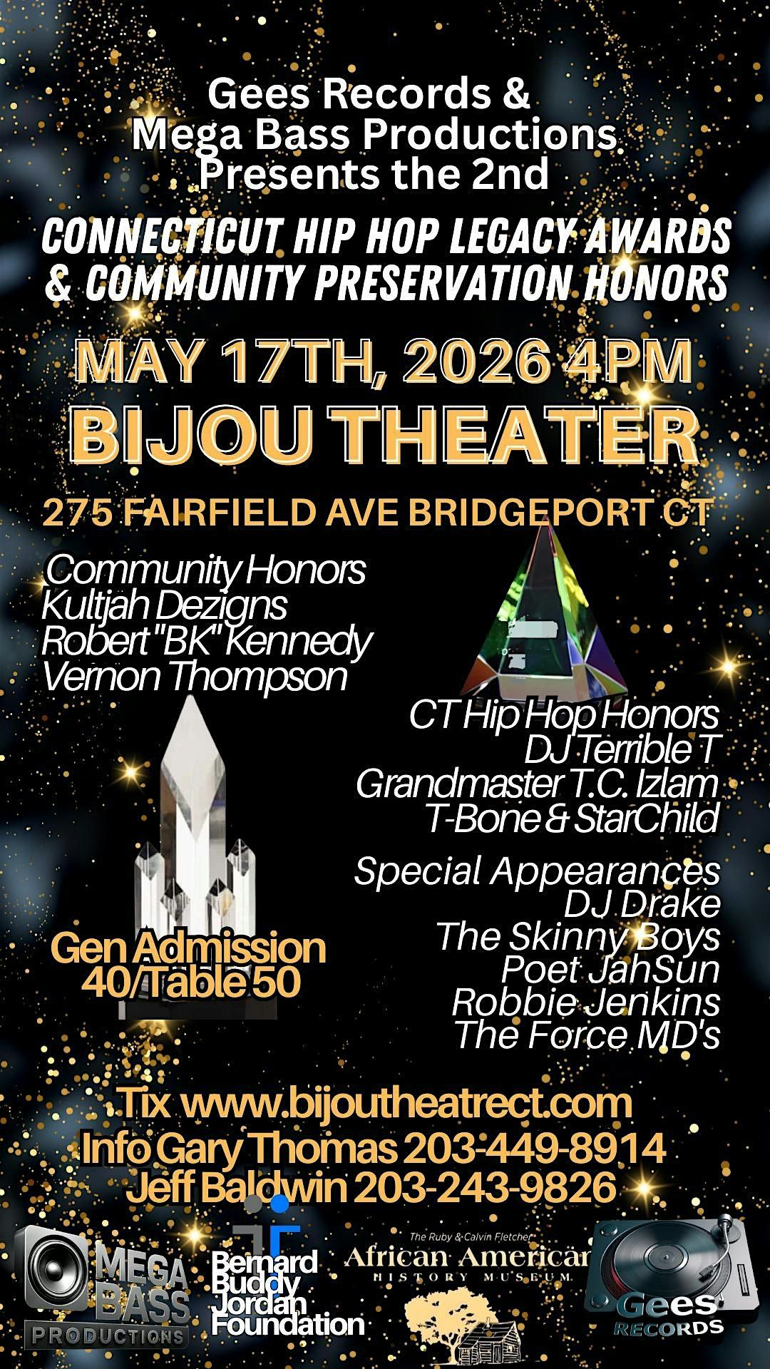 The Connecticut Hip Hop Legacy Awards & Cultural Preservation Gala is a historic cultural event dedicated to honoring the pioneers who helped shape Connecticut’s Hip Hop movement and its impact on the community. Hosted by Gees Records in partnership with Mega Bass Productions, this event will recognize groundbreaking artists and innovators while preserving their contributions through museum exhibits and cultural artifacts. Sponsoring this event provides a unique opportunity for organizations to support cultural preservation, youth empowerment, and community healing while aligning their brand with a powerful movement that celebrates history, creativity, and positive social impact. Sponsors will receive prominent recognition while helping ensure that the legacy of Connecticut Hip Hop & Community Leaders continue to educate and inspire future generations.