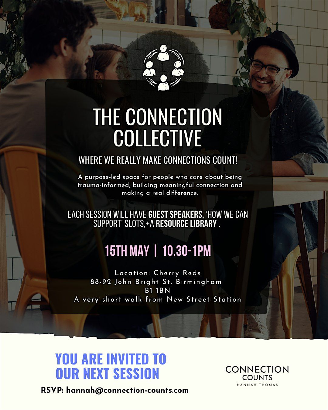 The Connection Collection events take place every 6 weeks at Cherry Reds in Birmimgham. Arrival at 10.30 where you are invited to purchase refreshments and food from the bar. We are located in the community room on the 1st floor (top of the stairs on the left)