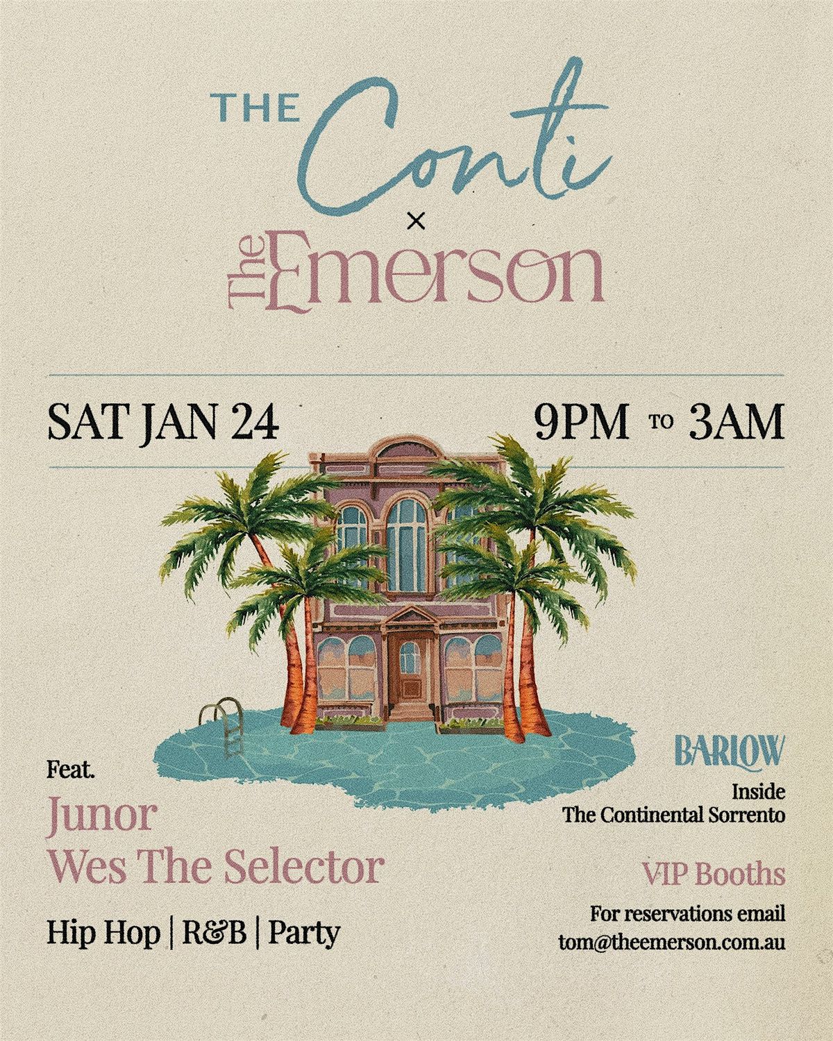 Come join us for a night of fun at The Continental Sorrento. Get ready for an exciting event where The Conti meets The Emerson.