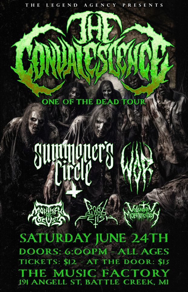 The Legend Agency Presents The "One Of The Dead Tour" featuring The Convalescence, Summoner's Circle, and WoR with special guests Mouthful Of Locusts, Goat Blood Fetish, and Voluntary Mortification at The Music Factory in Battle Creek, MI on June 24th. Doors at 6:00pm
