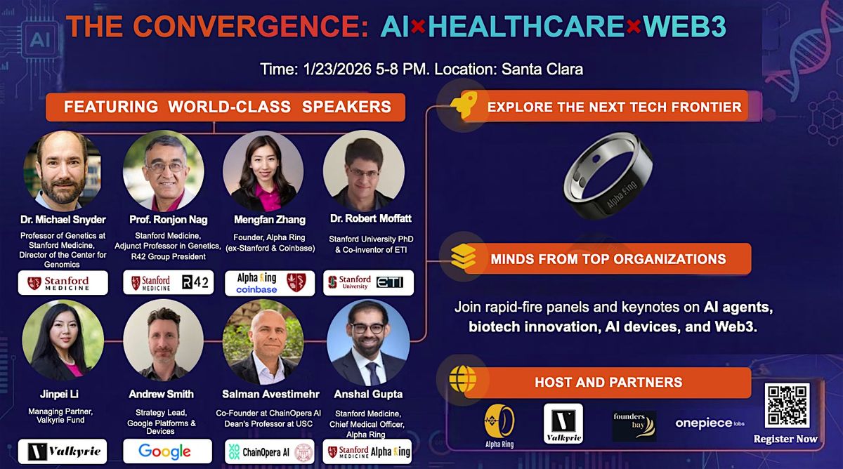 An approval-only briefing convening an elite circle of researchers and founders from Stanford, Google, Coinbase, Circle, Apple and the most advanced Healthcare & AI & Web3 startups and venture funds. We are gathering to map out the "Bio-Digital Stack". Join us to see how AI agents, sovereign health data, and next-gen wearables are disrupting a trillion-dollar healthcare industry.