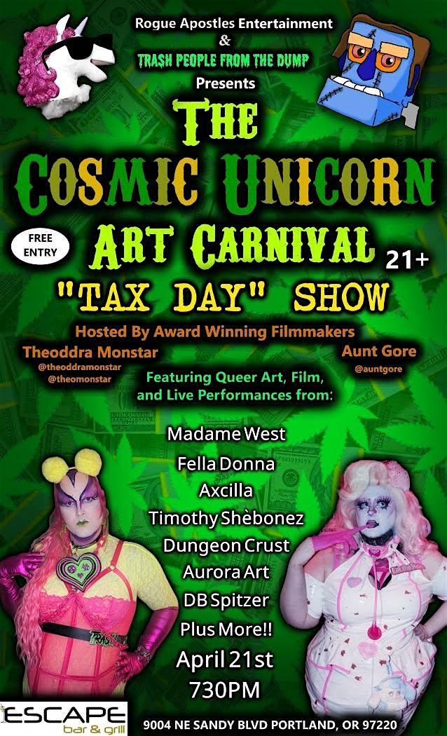 Escape Bar & Grill's Monthly Queer Art & Short Film and Drag Variety Showcase. No Cover. Hosted By Aunt Gore & Theoddra Monstar!