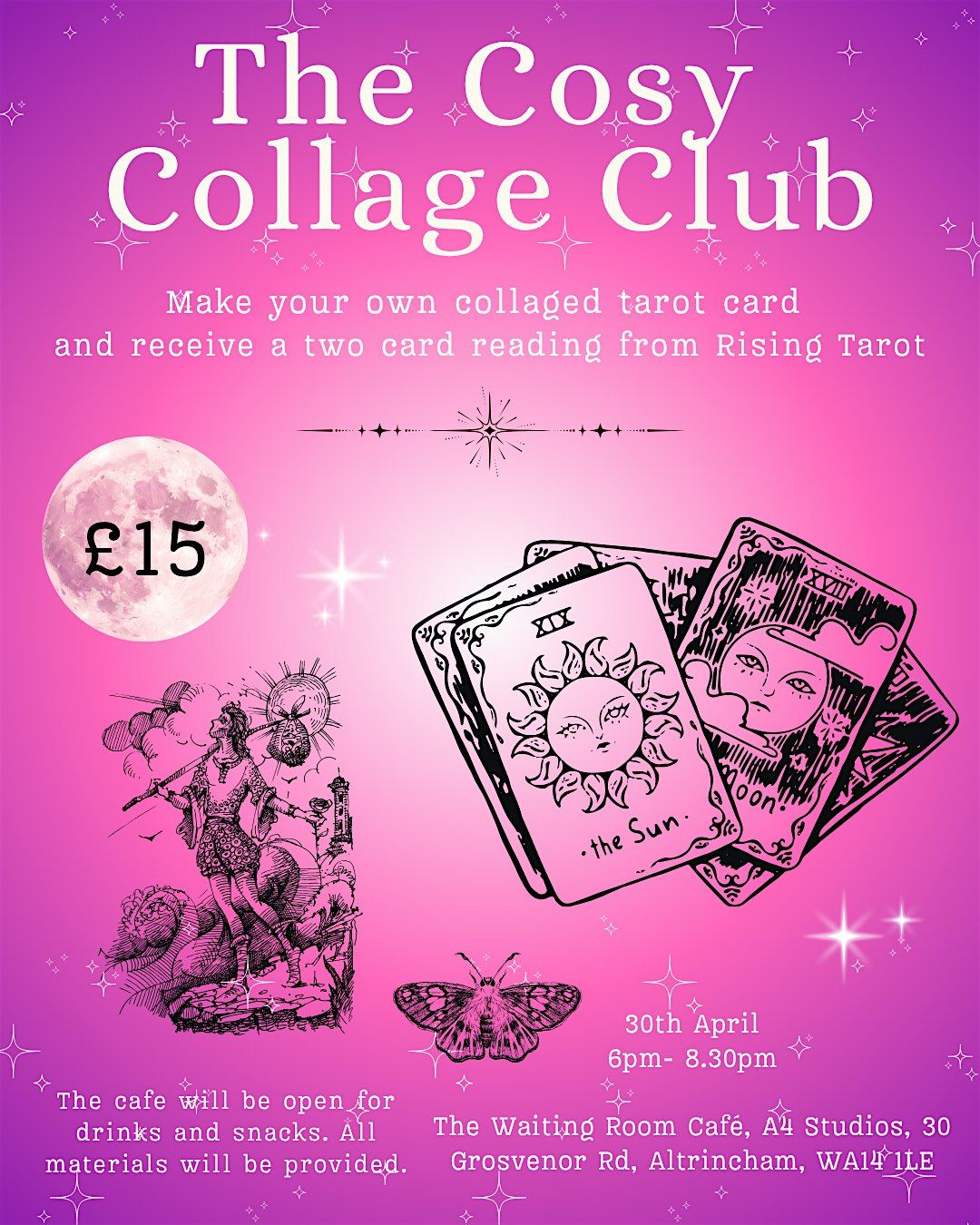 The workshop will begin with an art warm up activity and then for the main activity you will be guided in creating a your own tarot card through collage. Included in the ticket is a two card reading from Rising Tarot, which will take place during the event.