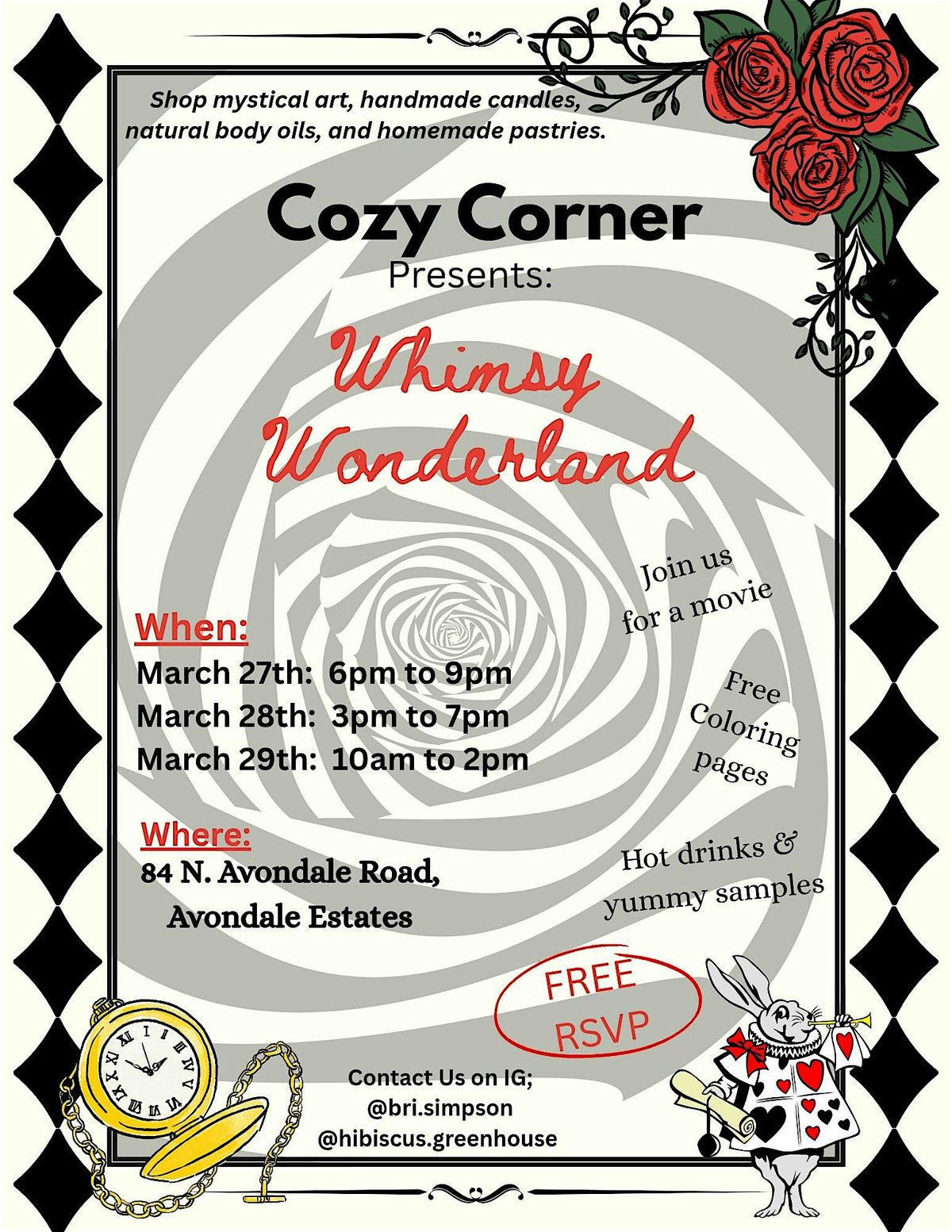 Tea party guests will enjoy a curated selection of sweet and savory treats paired with a magical tea blend prepared by co-host Hibiscus Greenhouse, while Alice in Wonderland plays softly in the background.