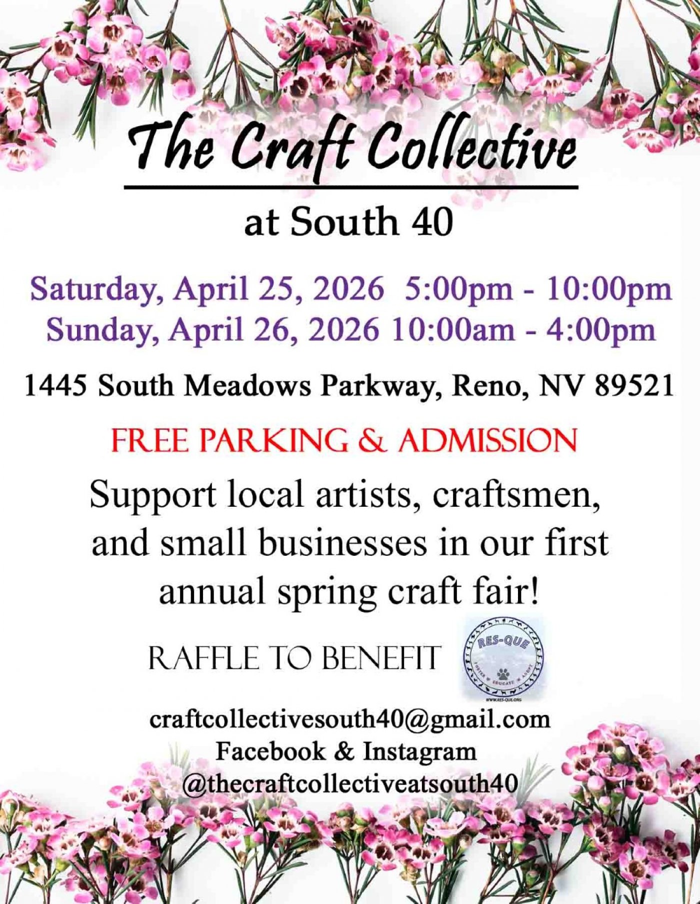 Join us for our 1st annual Spring craft fair at South 40! Featuring 25+ local vendors and business with handmade crafts. Free parking and admission. Raffle to support Res-Que.
