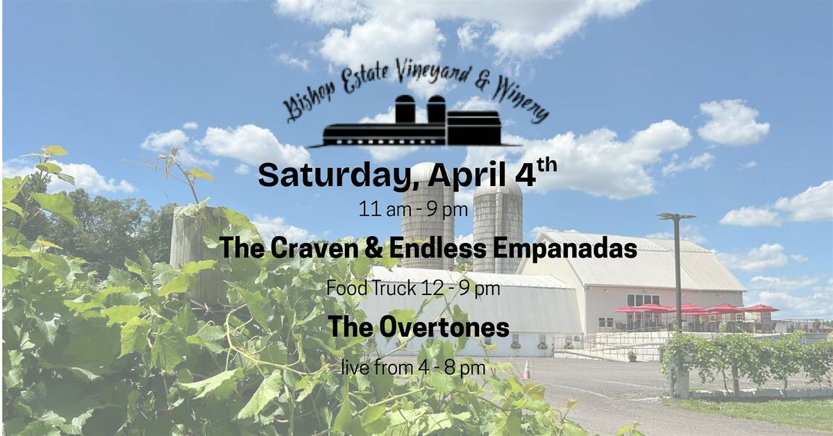 Come out to Bishop Estate Vineyard and Winery and enjoy some Saturday evening live music! The Overtones Acoustic Duo will be playing acoustic from 4-8 pm. We will have The Craven and Endless Empanadas Food Trucks on site from 12-9 pm if you want to grab a bite to eat to enjoy with your wine!