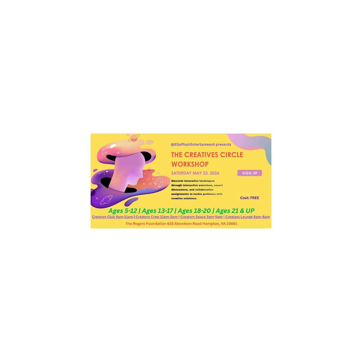 π¨ I would like kids, teens, young adult & adult (5 & UP); creatives, small business owners, and entrepreneurs to signup for Sponsor, Business Session Speaker, Vendor, Drink Server, Caterer, Host, Photographer, Videographer or DJ positions.