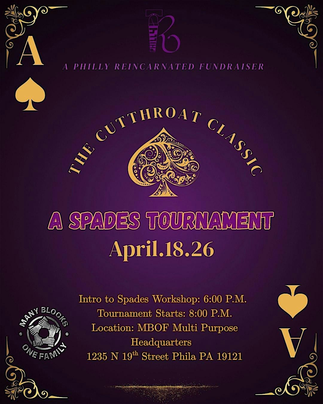 Get ready to shuffle and deal at The Cut Throat Classic Spade Tournament Fundraiser! Join us in person for a night full of laughs, friendly competition, and great vibes. Whether you’re a seasoned card shark or just looking for some fun, this tournament is where you wanna be. Bring your A-game, mingle with other players, and support Philly Reincarnated's first fundraiser of 2026!